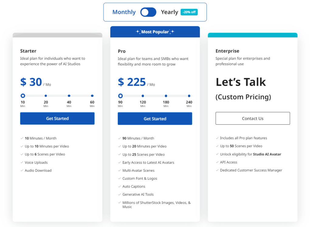 3. Enterprise Plan: This comes with custom pricing and is designed for long-term professional use. It includes all the features of the Pro plan, along with custom AI avatars, up to 50 scenes per video, and 24/7 priority support.