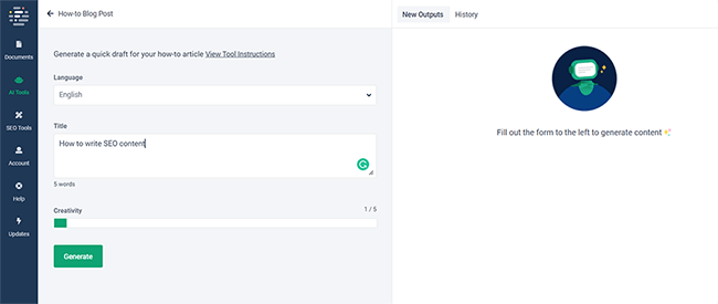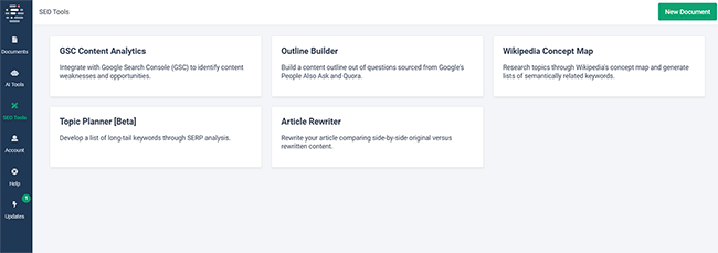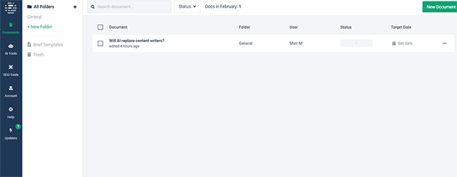 From the side navigation bar, you can access all the AI and SEO tools you need. And you can manage your projects from the Documents page.
