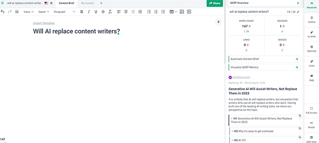 Surfer SEO is our favorite Frase alternative. It’s more of an optimization toolkit for content writers than an AI writer and stands out for its best-in-class SEO scoring and optimization recommendations.