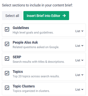 The brief is there to guide your content writing efforts and can include things like guidelines, topic clusters, questions to add, statistics to include, hyperlink suggestions, and more.