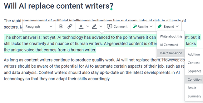 There are other things you can do with the Expand tool too. For example, click Insert Transition, and you can tell Frase to add another paragraph starting with a specific transition word.