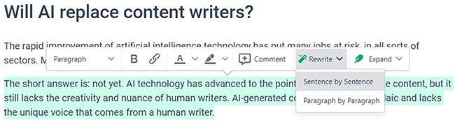 Highlight any text inside the editor, and a toolbar will pop up. On this toolbar, there are some really cool AI options