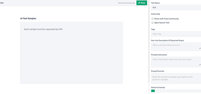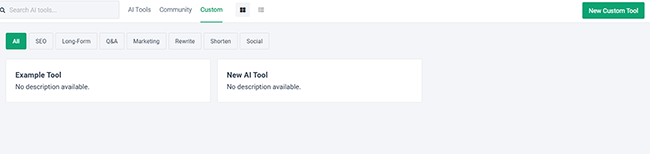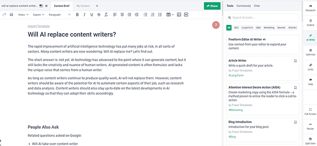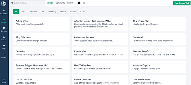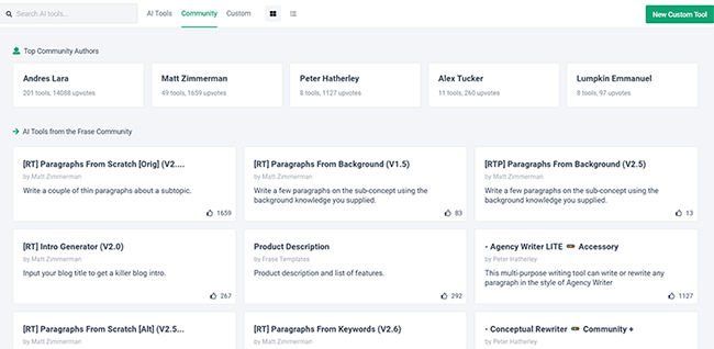 • Very flexible. What makes Frase better than most other AI writers is how flexible it is. Thanks to the community feature, there is a near-limitless number of templates to choose from covering every use case imaginable. And you can even program your own templates with the Custom Tool feature.