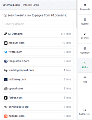 From the content editor, click the Research tab, and you’ll be able to see a list of all the top search competitor articles and the headers they’re using in the content.