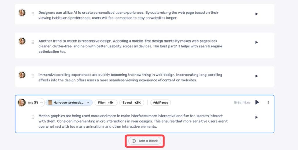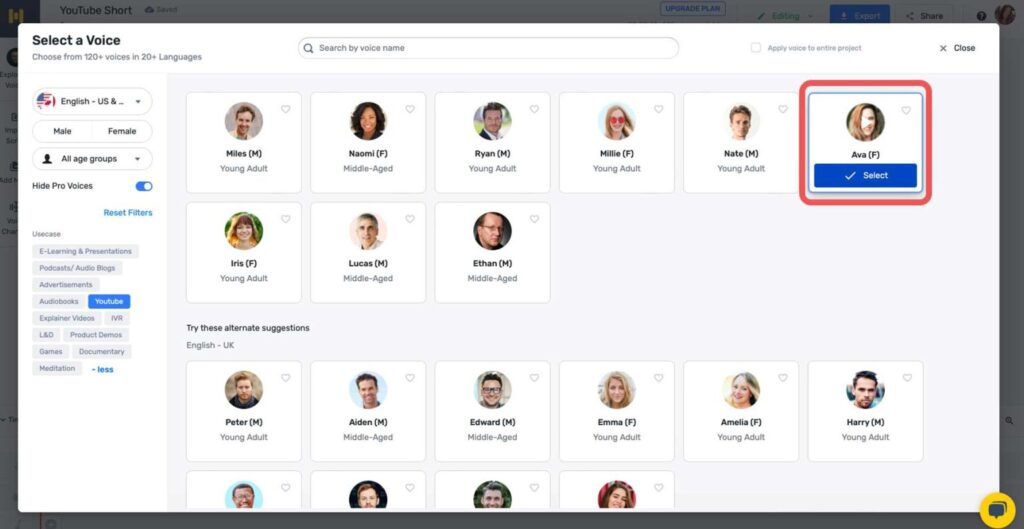 We’ll use Ava for our video because she has the most natural-sounding voice for our project. However, feel free to preview each one to determine which one works best for your situation. Once decided, click the select button.