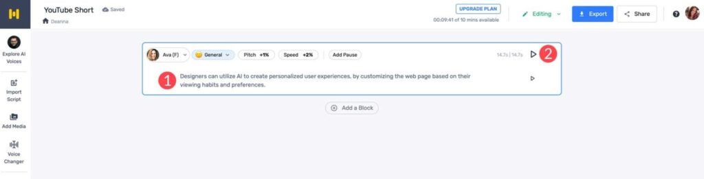 We’ll copy the first section of the script and paste it into Murf AI. Click the play icon on the right to generate the audio clip. Once complete, you can preview your clip using the same button.