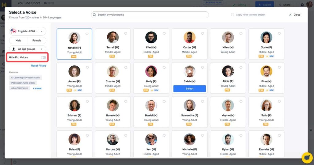 If you’re following along with the free version, toggle Hide Pro Voices to view the available voices.