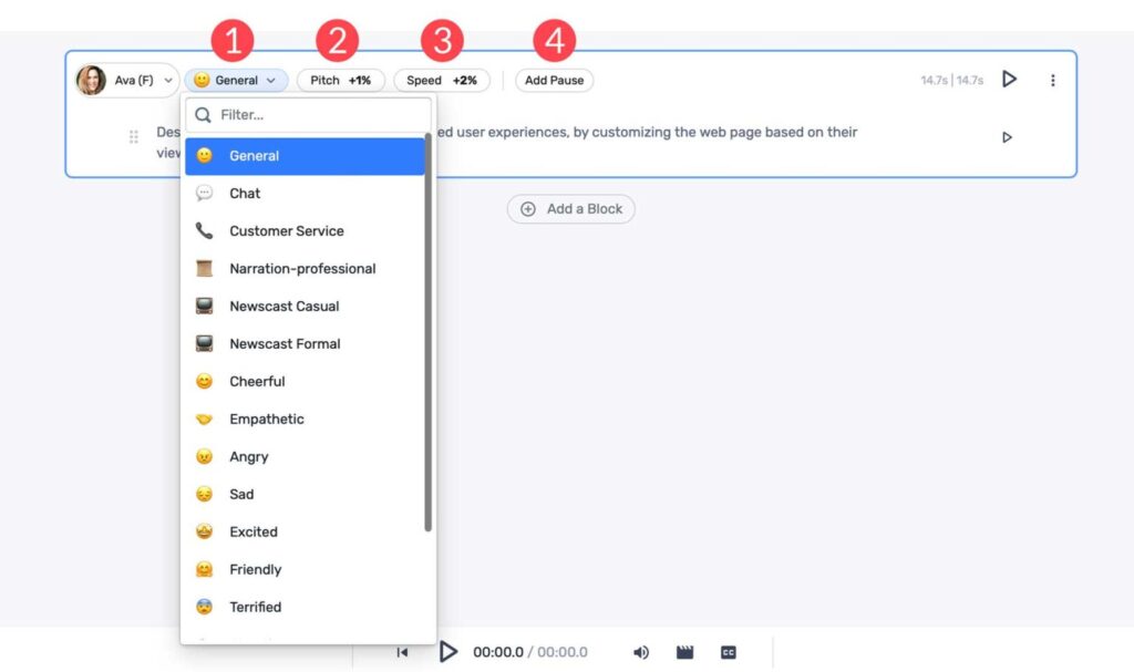 Once your audio is generated, you can preview the audio using the same play button. Murf AI comes with a few settings to help you adjust the output. These include tone (1), pitch (2), speed (3), and the ability to add a pause (4). These come in handy if the generated voice is too computer-like, has awkward run-on sentences, or needs to be adjusted to a lower or higher sound (pitch).