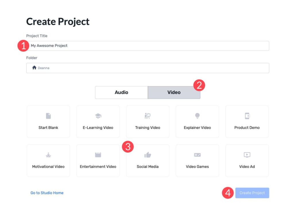 Next, give your project a name (1), select the video tab (2), choose social media as the format (3), and click the Create Project button (4).